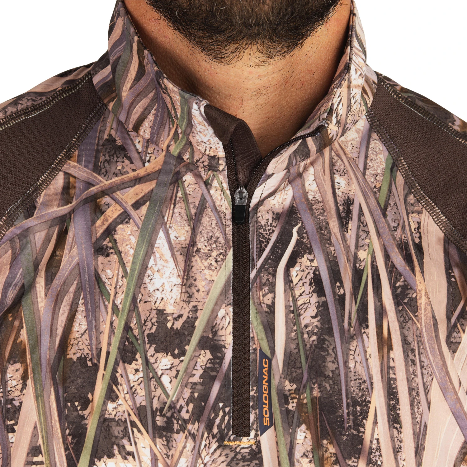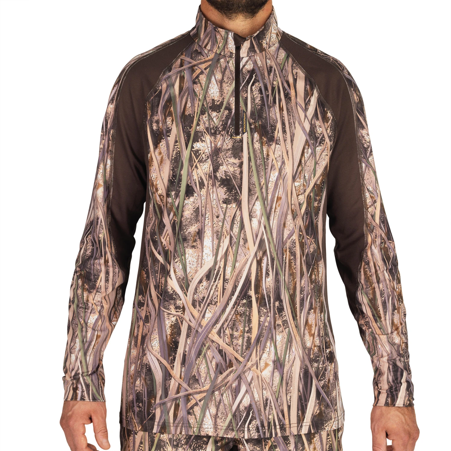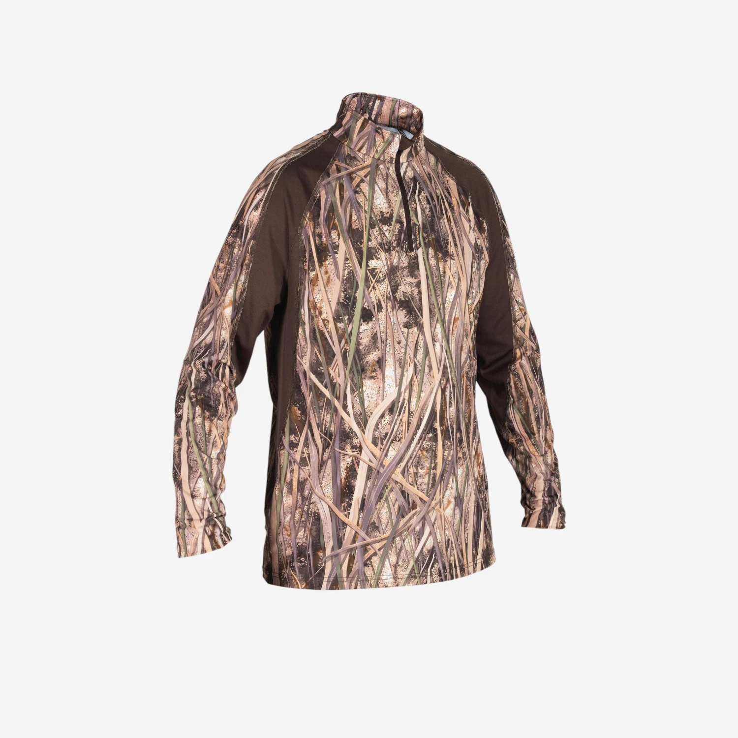 This long-sleeved T-shirt, designed for game and waterfowl hunters, uses the exclusive SOLOGNAC wetlands camouflage for greater stealth in the eyes of ducks, geese and teals. With its ultra-realistic pattern of vegetation (rush, grass, reeds), a distinct 3D effect, and a high contrast between the light and dark shades, this T-shirt lets you blend into any environment where waterfowl are hunted.