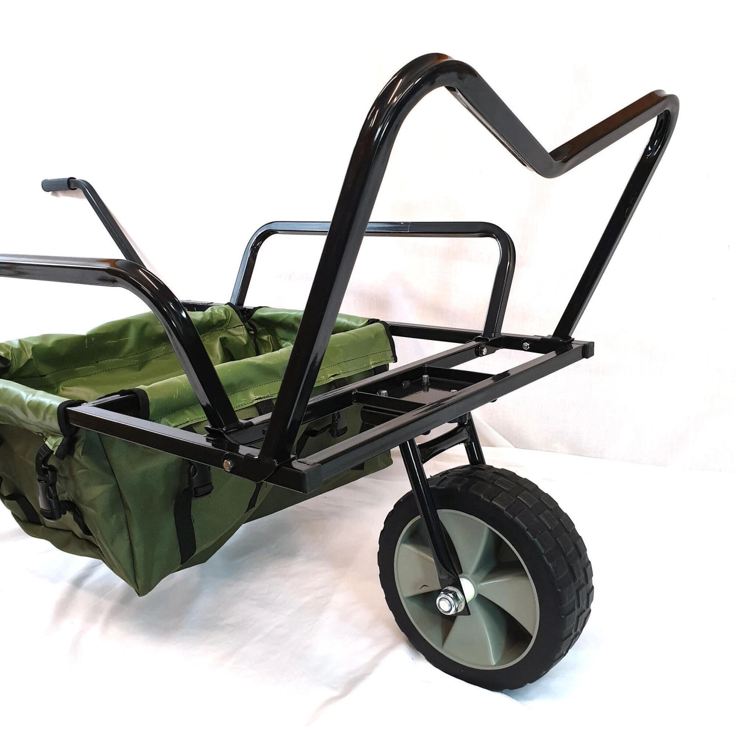 Heavy duty one wheel wheelbarrow which makes carrying heavy loads simple and easy. This barrow has a huge carrying capacity and with a 10″ puncture proof tyre it is good an any terrain and will handle far heavier loads than a standard fishing trolley.