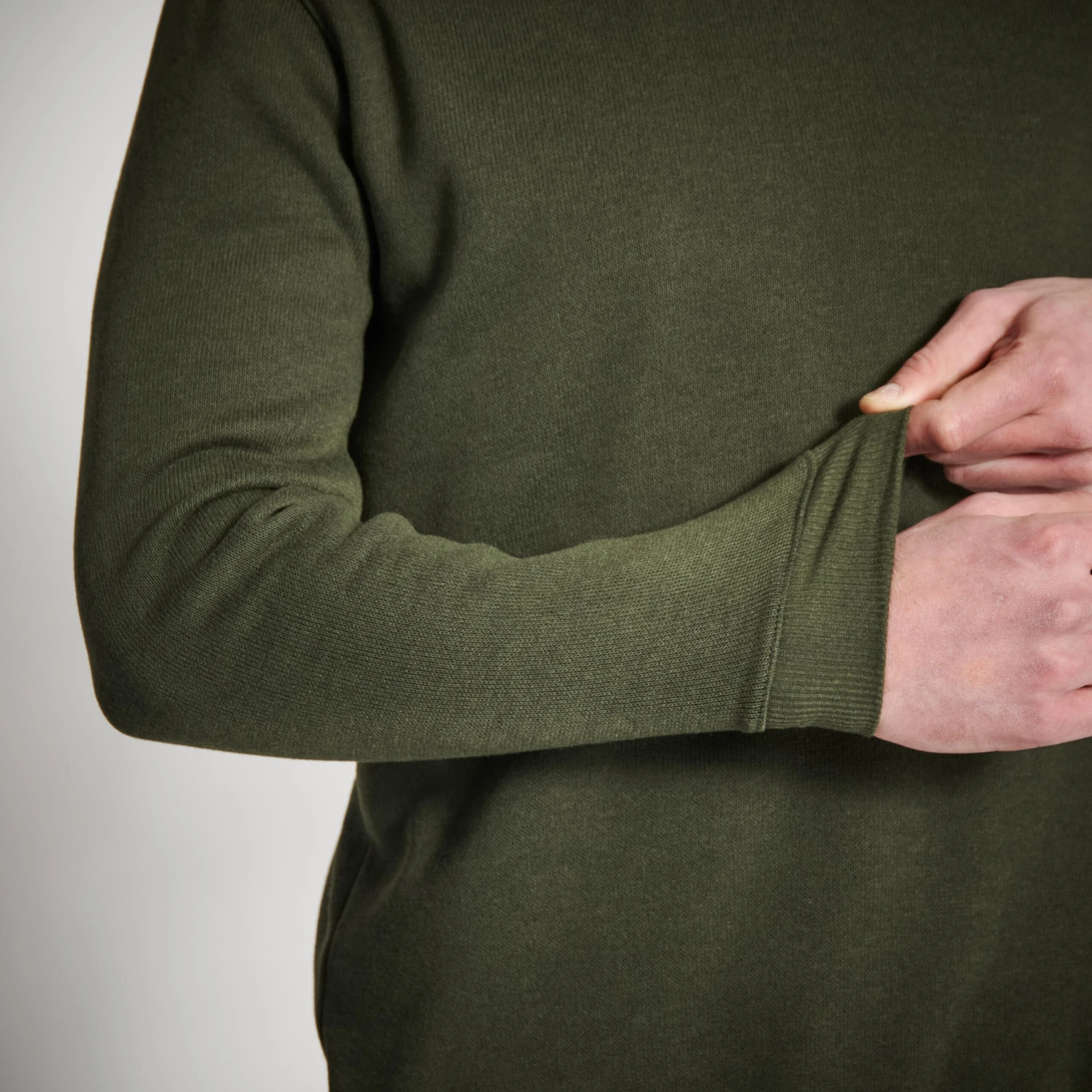 To make sure that you can hunt in comfort when the temperature drops in autumn and early winter, our designers have developed this pullover to protect you from the cold in the simplest way possible: a discreet design round neck pullover with elasticated cuffs to keep out the cold. Brushed polyester material on the inside for softness and warmth. The material will resist wild vegetation and repeated washing.