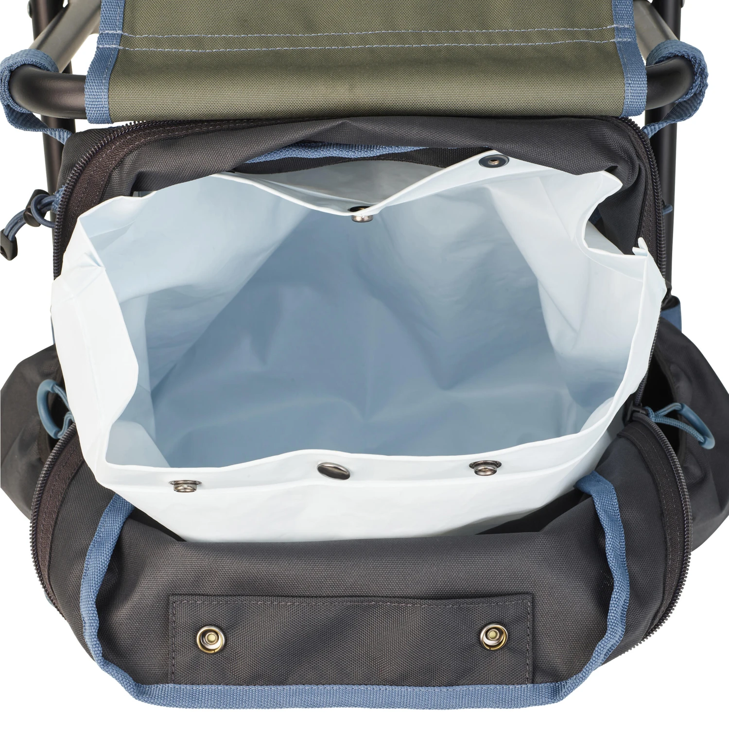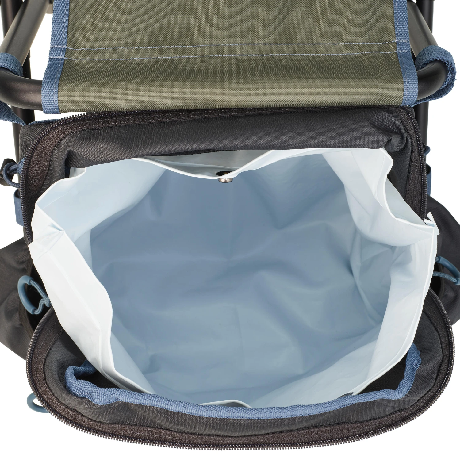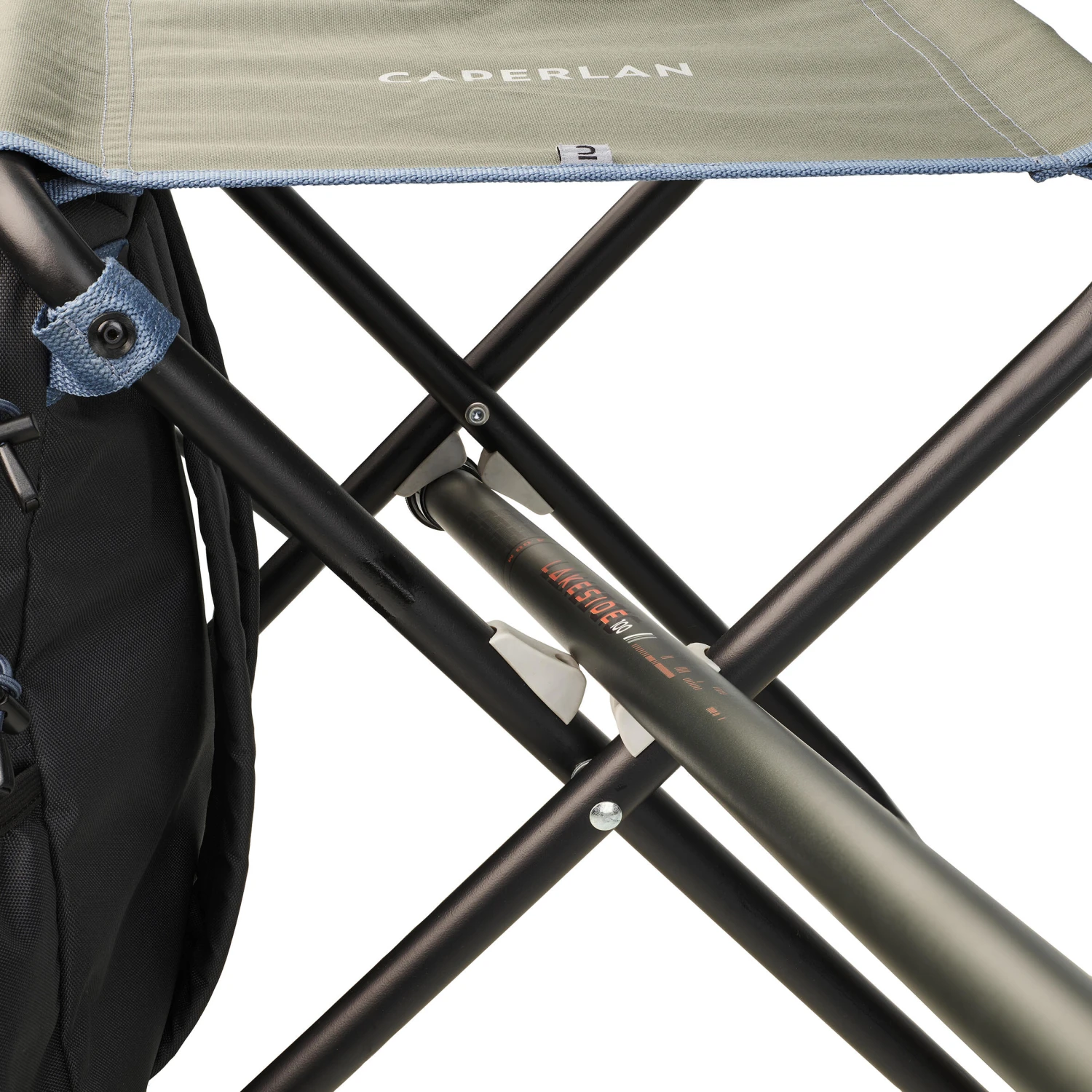 The itinerant fisherman carrying on his back a folding seat and his fishing equipment.A folding seat + a backpack full of great ideas for carrying all your fishing equipment.