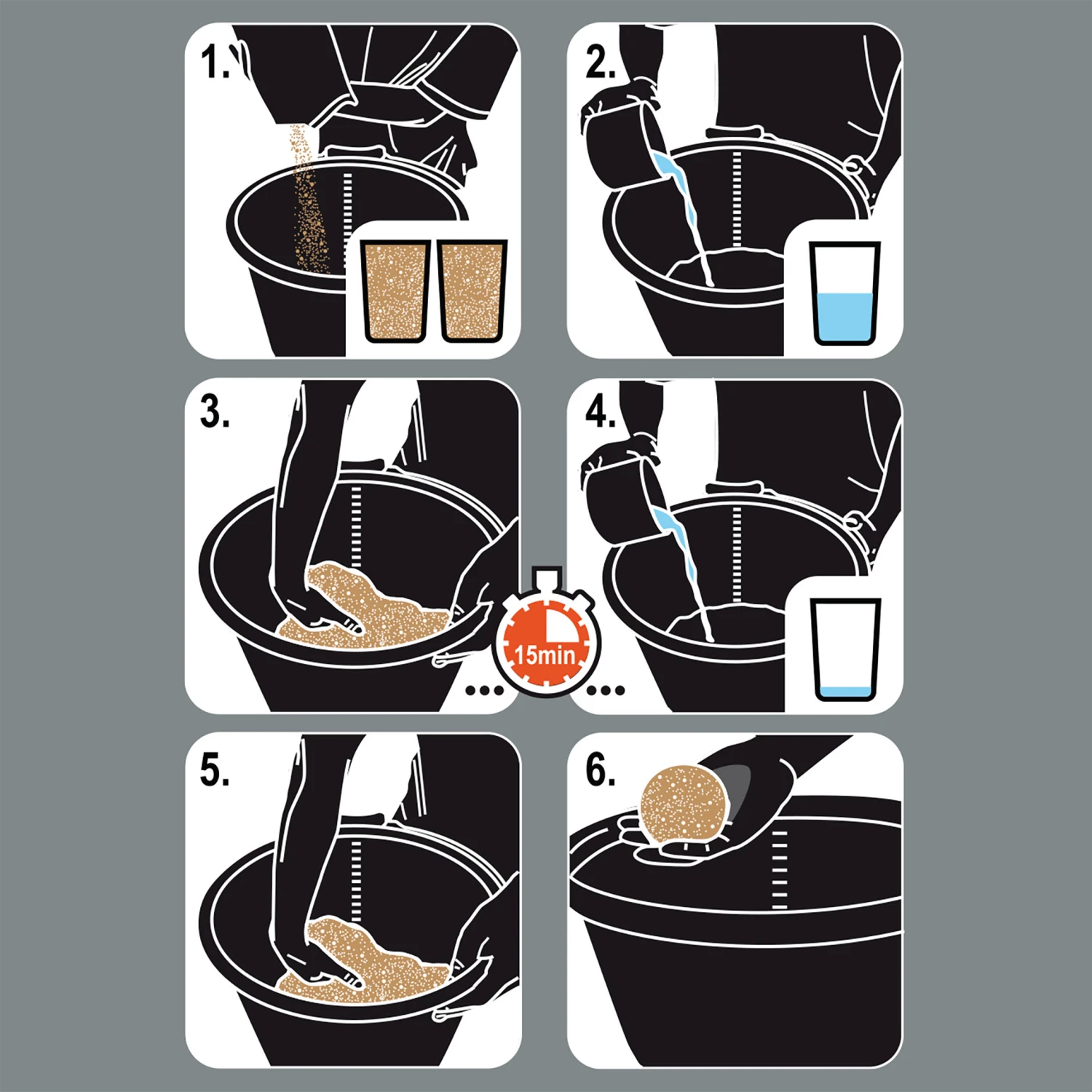 Allow the bait to rest for 15mins, then pour in the rest of the water to create a substance that is sufficiently wet for you to form balls.