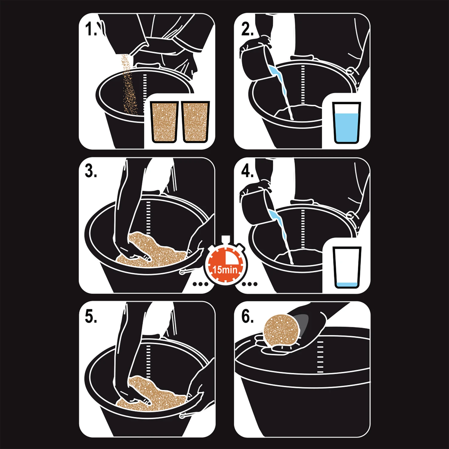To wet the bait, start by pouring 3/4 of the total volume of water necessary onto the bait in a round bucket. Mix energetically with hands to ensure that the particles that make up the bait absorb plenty of water.