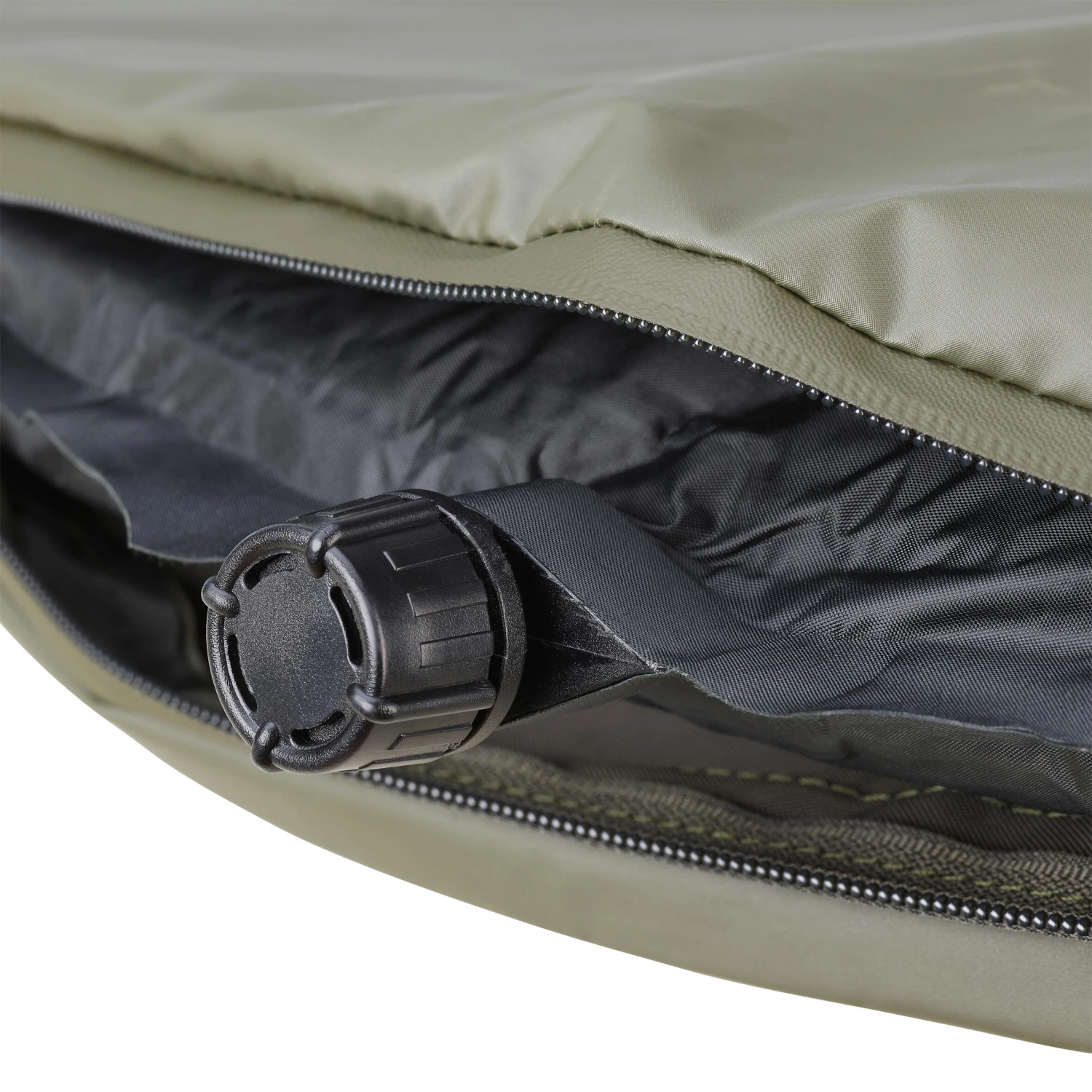 The self-inflating mat can be used without the pop-up structure. For example, we have equipped it with a hook and loop strap to make it more compact when you want to use it alone. When rolled up and secured, the mat takes up very little space. This trick is particularly useful when the aim is to carry a minimum of equipment for fast fishing.